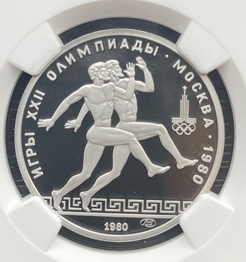 Слева и сверху вдоль канта слова «ИГРЫ XXII ОЛИМПИАДЫ», справа разделенные точкой слово «МОСКВА» и год проведения XXII Олимпиады «1980», в середине фрагмент соревнований древних бегунов, справа эмблема XXII Олимпийских игр, ниже справа монограмма монетного двора «ЛМД», внизу у канта год выпуска монеты «1980».