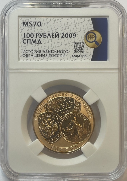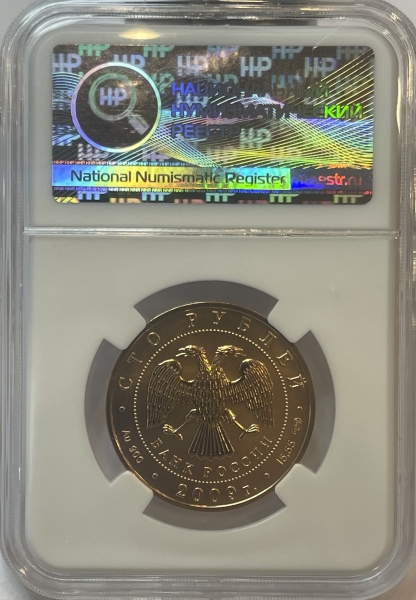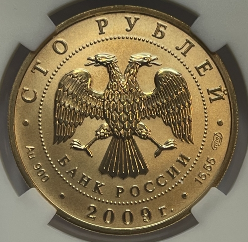 Вверху вдоль канта номинал «СТО РУБЛЕЙ», внизу слева химическое название «Au» и проба «900» металла, внизу по центру год выпуска «2009 г.», внизу справа чистый вес находящегося в монете драгоценного металла «15,55» и монограмма монетного двора «СПМД». В середине в ободке из точек двуглавый орел под ним с внутренней стороны точечного ободка слова «БАНК РОССИИ».