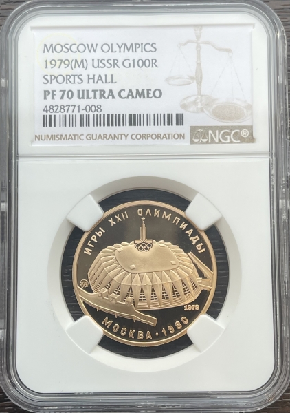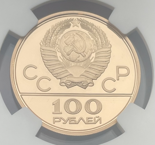 Сверху герб СССР с 15 витками ленты, слева от него буквы «СС», справа «СР», ниже двойная черта, под ней обозначение достоинства монеты цифра «100» и ниже слово «РУБЛЕЙ».