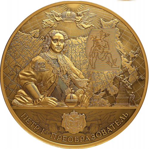рельефные изображения портрета Петра I с императорскими регалиями, и ангелов, поддерживающих корону, на фоне карты Российской империи и стелы с аллегориями империи; справа расположено растровое изображение, представляющее собой аллегории успешной торговли и созидания, видимые поочередно при изменении угла зрения; в нижней части — рельефное изображение двуглавого орла, наложенного на горностаевую мантию, на фоне выполненной в технике лазерного матирования композиции из военной атрибутики; внизу по окружности имеется рельефная надпись: «ПЕТР I • ПРЕОБРАЗОВАТЕЛЬ».
