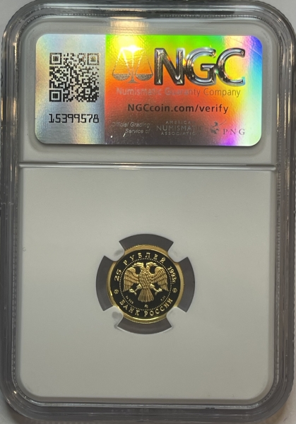 в центре диска - эмблема Банка России (двуглавый орёл художника И. Билибина), под ним: слева - обозначение металла, проба сплава, в центре - товарный знак монетного двора, справа - содержание драгоценного металла в чистоте. По окружности надписи, обрамлённые кругом из точек: вверху - "25 РУБЛЕЙ 1993 г.", внизу - "БАНК РОССИИ".